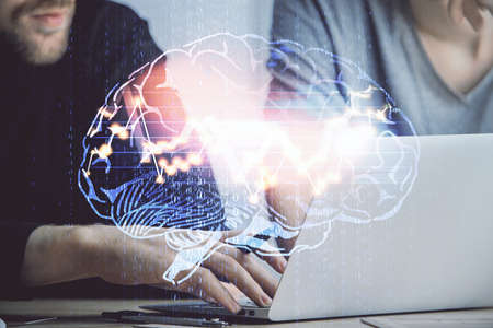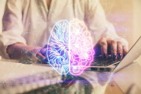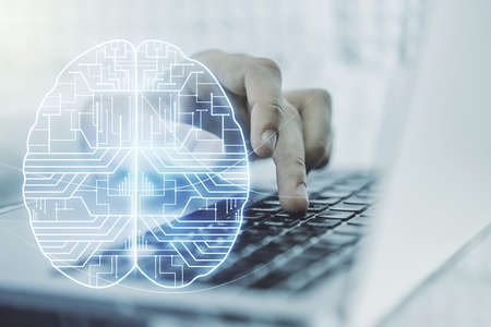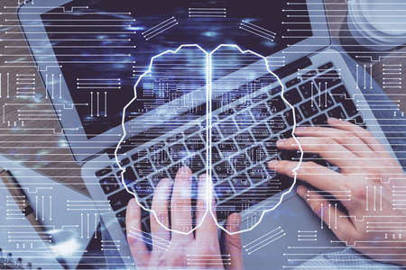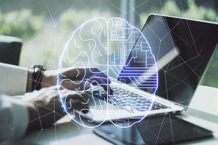 Creative artificial Intelligence concept with human brain hologram and hands typing on laptop on background. Multiexposure
