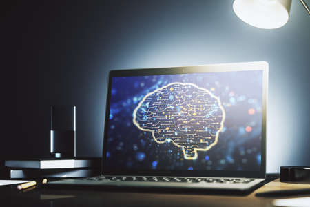 Creative artificial Intelligence concept with human brain sketch on modern laptop monitor. 3D Rendering
