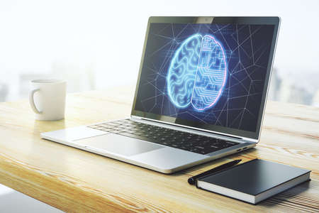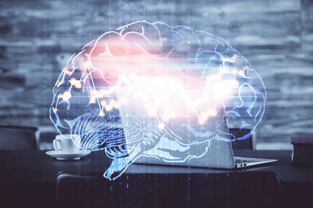 Creative artificial Intelligence concept with human brain hologram on modern laptop background. Multiexposure