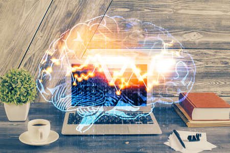 Multi exposure of work table with computer and brain hologram. Brainstorm concept.