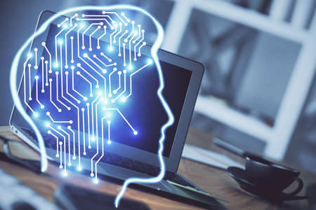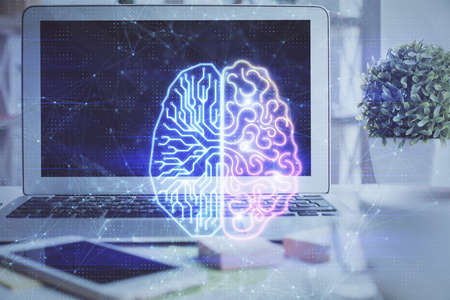 Double exposure of creative artificial Intelligence symbol with modern laptop on background. Neural networks and machine learning concept