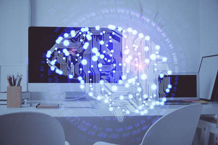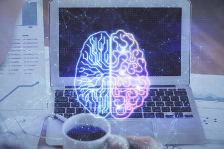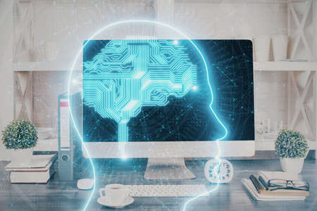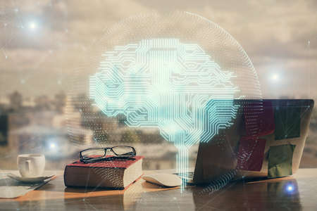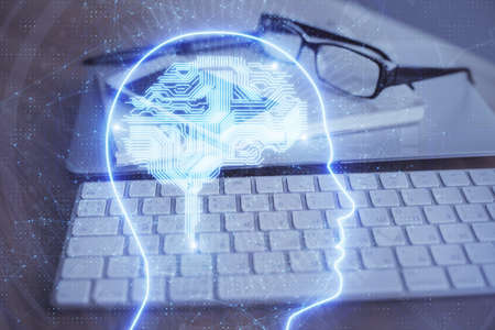 Double exposure of desktop with computer and brain drawing hologram. Artificial intelligence concept.