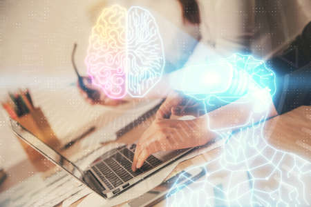 Double exposure of woman hands working on computer and brain hologram drawing. Ai concept.