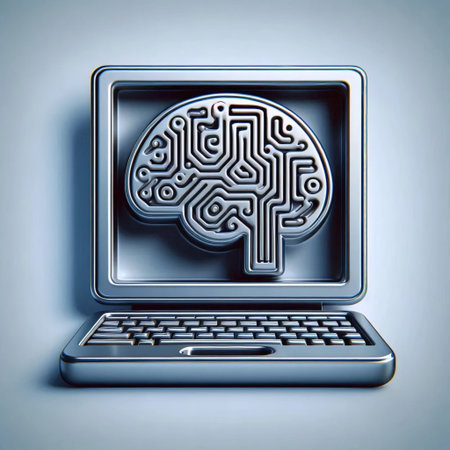A laptop screen showcases a luminous brain illustration superimposed over code. The image features a modern, indoor environment with soft lighting and a blurred background. This visual can be utilized for various commercial purposes, including marketing materials and editorial content focusing on technology and innovation.