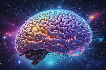 A colorful representation of the human brain showcases neural connections glowing in a cosmic atmosphere.