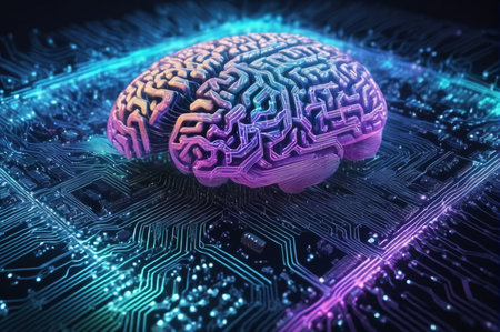 A realistic model of a human brain rests atop a complex circuit board, symbolizing technology and neuroscience.