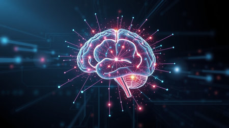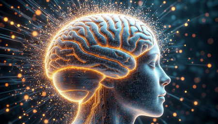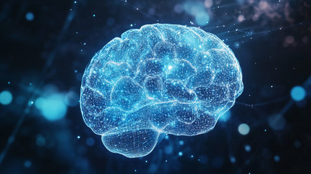 3d rendering of a human brain with glowing particles in the background