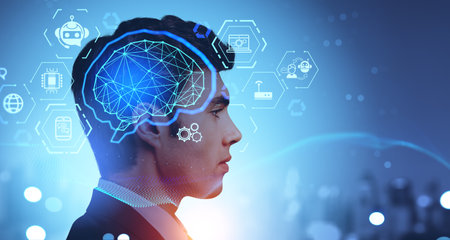 Portrait of young European businessman in blurry night city with double exposure of immersive AI interface. Concept of machine learning