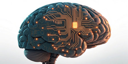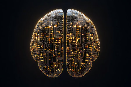 Abstract brain representation with circuit board patterns visualizing technology and human intelligence.