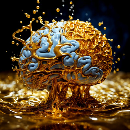 3d illustration of golden metallic brain with blue and yellow liquid inside.