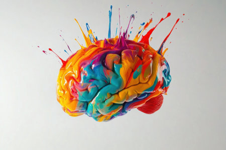 A brain model covered in vibrant paint strokes and splashes amplifies the concept of artistic expression through vivid colors and design.