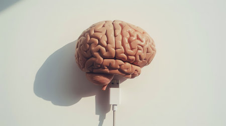 Top view of human brain model with USB cable, on light background. Turn on your brain. Creative ideas. Generative AI.