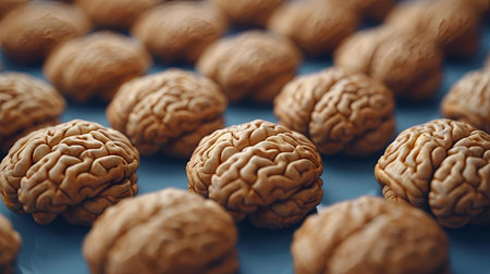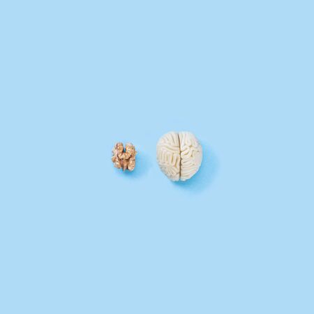 Walnut and brain mock up on a blue background. The shape of the human brain is similar to walnut kernels. This symbolizes the similarity of the brain to walnuts and the proven effectiveness as a healthy.