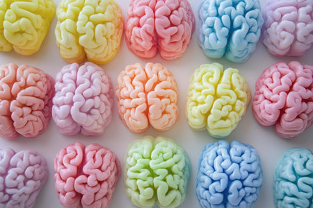 A vibrant array of small brain models showcases various pastel colors, creating a fun and educational display. Each brain is designed with intricate details, suitable for teaching or decoration.