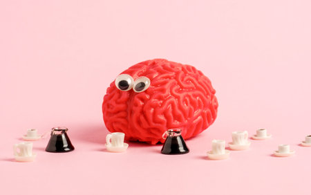 Funny human brain model with googly eyes and a lot of coffee cups. Benefits and harm of coffee concept.