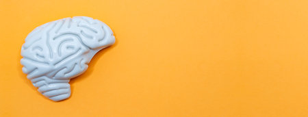 Plastic brain. Banner with space for text. Orange background. World Brain Day July 22. Horizontal photography.
