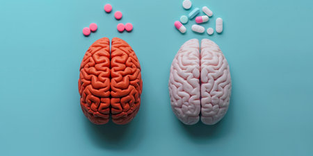 Two brains, one red and one white, with pills scattered around them