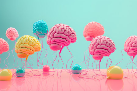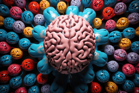 This illustration depicts a brain with interconnected neural networks, featuring blue and red hemispheres