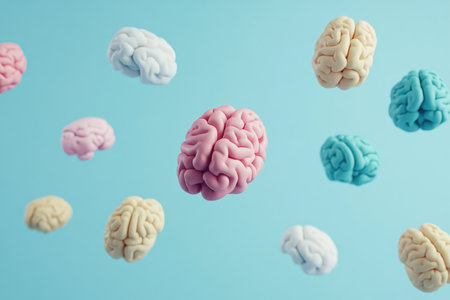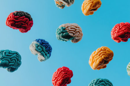 Floating Colorful Brain Models Against Blue Sky Background - Suitable for Medical and Educational Designs.