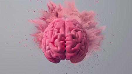 Pink human brain with powder explosion on gray background, creative concept.