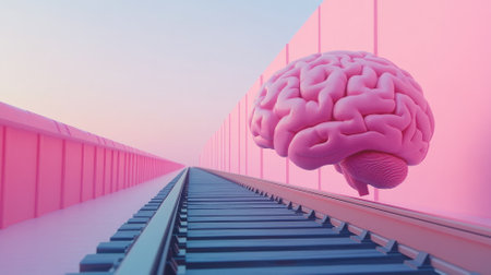 Floating brain over train tracks, surreal pastel scene