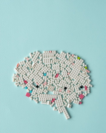 Brain silhouette made of white building blocks on light blue background, top view, with copy space.