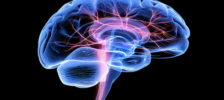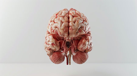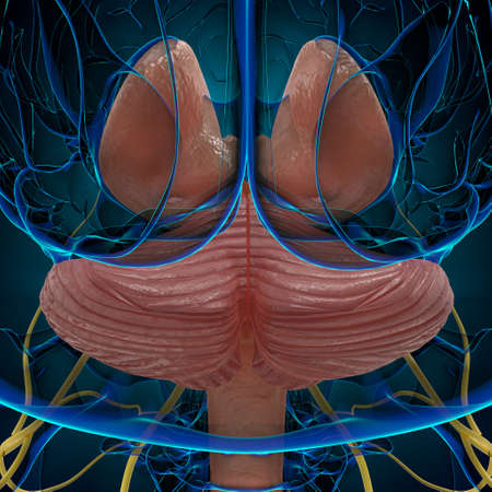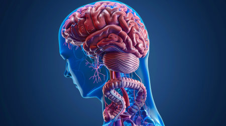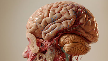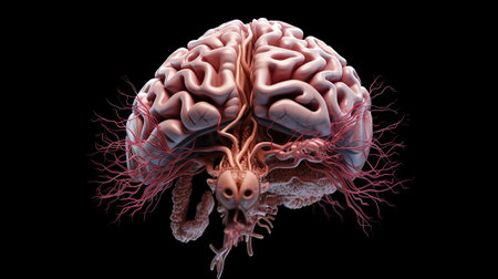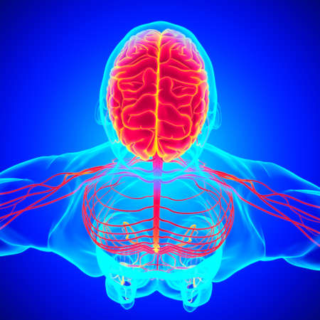 Human brain anatomy 3D illustration showing nervous system and blood vessels