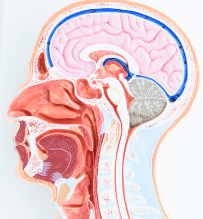 Detailed anatomical model showcasing the intricate internal structures of the human head and neck, including the brain, throat, and major vessels, for educational purposes.