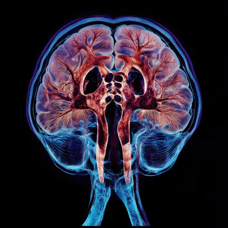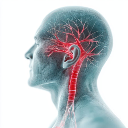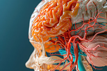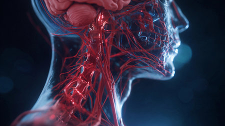 Depiction of human anatomy highlighting cranial and vascular systems with intricate detail and vibrant colors against a dark background