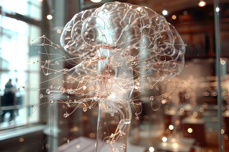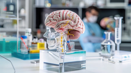 This image showcases a detailed model of the human brain with nerve structures displayed in a laboratory setting, ideal for medical research and educational purposes.