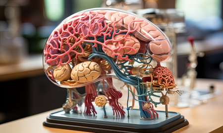 This image features a detailed human brain model, showcasing the vascular structure, set in a modern laboratory environment, ideal for educational materials.