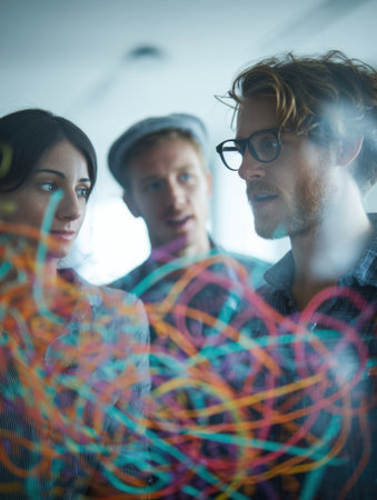 The creative team shares ideas while viewing colorful abstract visuals on a transparent surface, sparkling dynamic collaboration.