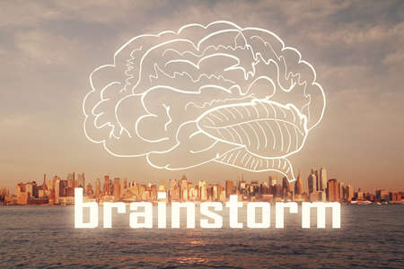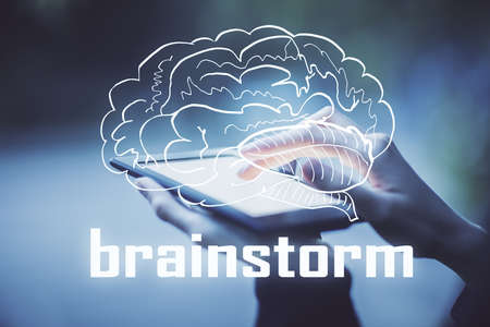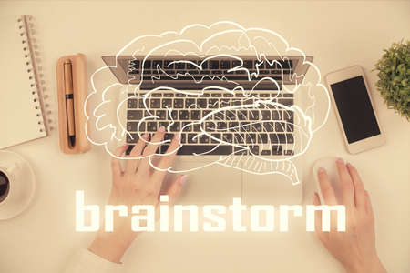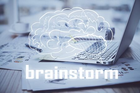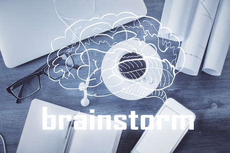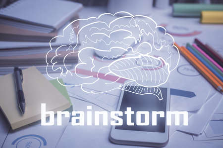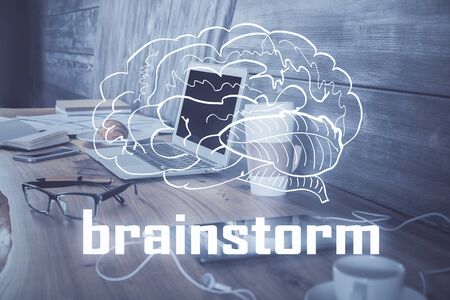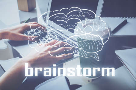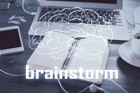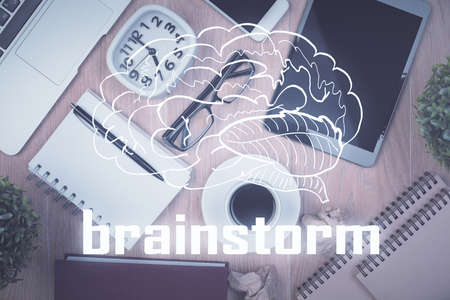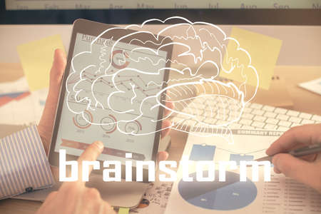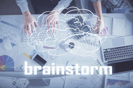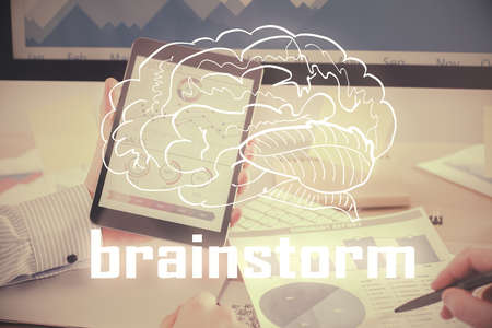 Start up creative drawing over close up hands on background. Concept of brainstorming. Multi exposure