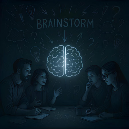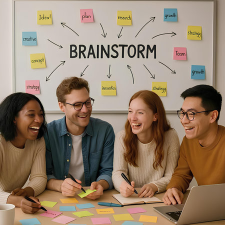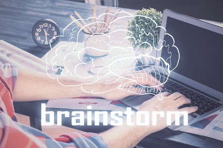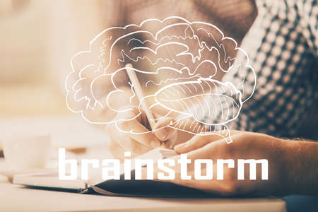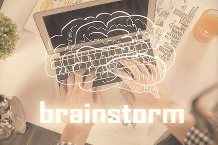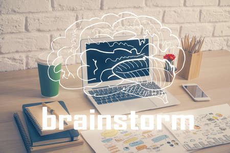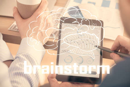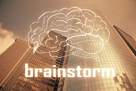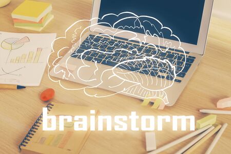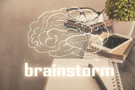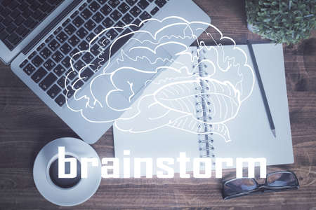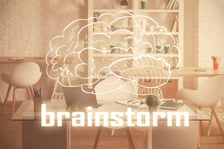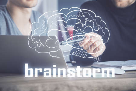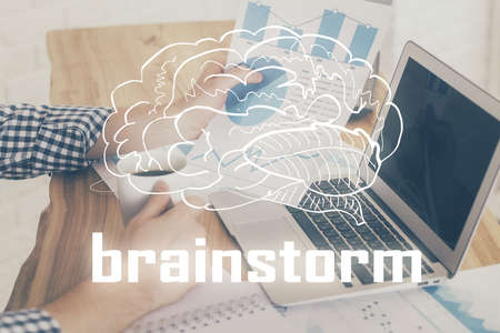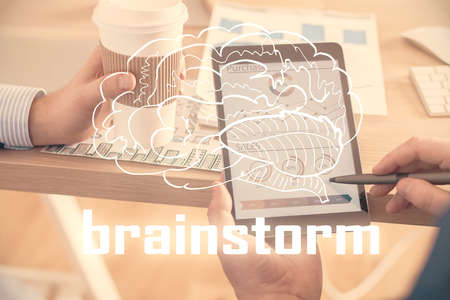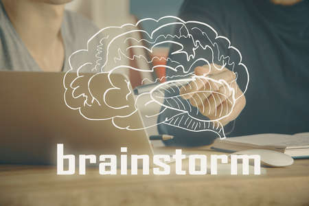 Brainstorming Concept. Brainstorm word written on photo of diverse group of people discussing plan in the background