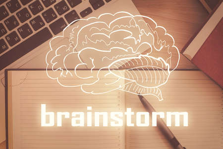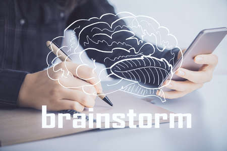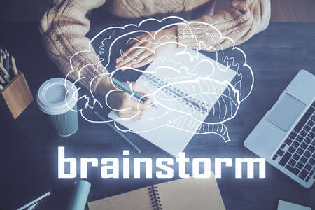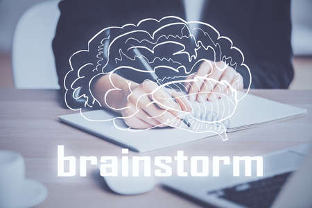 Start up creative drawing over close up hands in notepad background. Concept of brainstorming. Double exposure