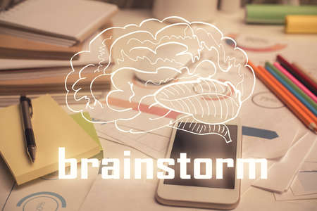Multi exposure of creative drawing over table with phone. Top view. Concept of startup.
