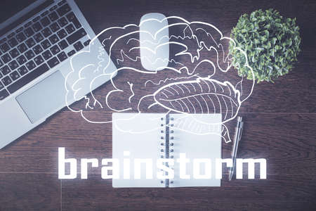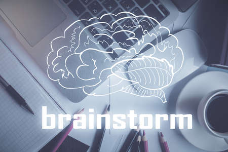 Start up theme drawing over computer on the desktop background. Top view. Double exposure. Brainstorm concept.
