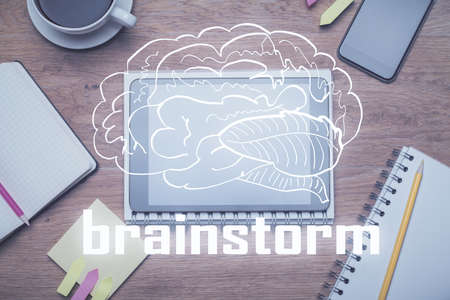 Brainstorming Concept. Brainstorm word written on photo of diverse group of people discussing plan in the background