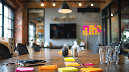 A modern office scene featuring a large wooden meeting table with colorful sticky notes and bottled water, promoting a creative space for brainstorming and collaboration.