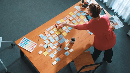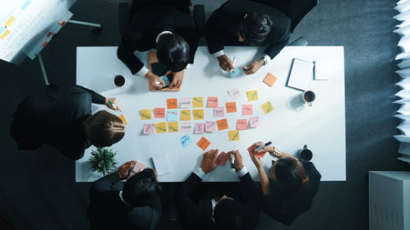 Top down aerial view of professional business people writing and sharing marketing idea on sticky note. Group of diverse executive manager working together or brainstorming strategy. Directorate.