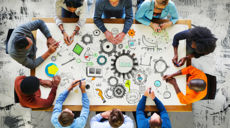 Teamwork concept - top view of six people generate ideas and brainstorming.