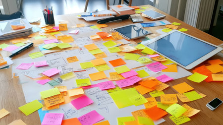 A vibrant workspace during a brainstorming session, featuring colorful sticky notes and design mockups on a wooden table. Ideal for creative processes.