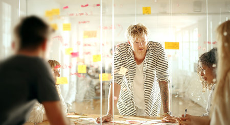 Teamwork, planning and writing on sticky notes while brainstorming, talking and sharing ideas. Manager leading diverse group of creative business people in meeting while showing vision and innovation