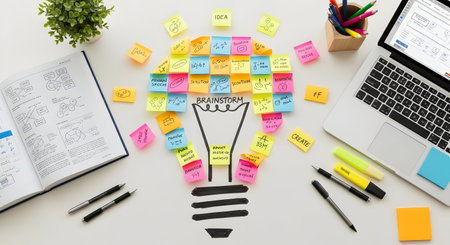 A vibrant brainstorming session featuring diverse hands working together on a large paper, surrounded by colorful sticky notes and markers, full of innovative ideas.