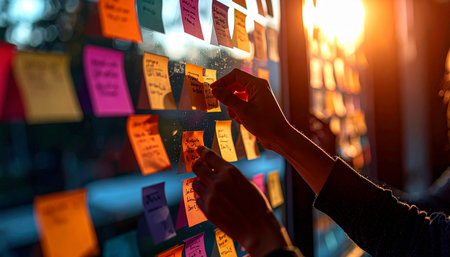 Closeup of a glass window covered with assorted sticky notes orange, purple, teal filled with creative ideas and doodles, sunlight streaming through, blurred coworker hands out of focus adding more notes