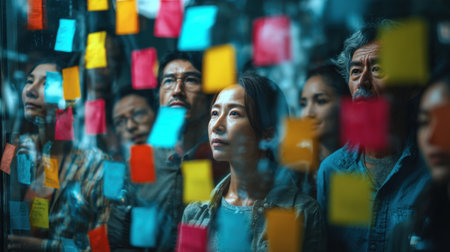 Diverse group of people gazes intently at wall covered in colorful sticky notes, reflecting deep contemplation and collaboration. atmosphere is charged with curiosity and engagement