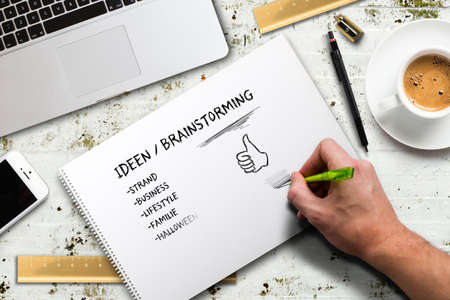 Brainstorm concept on wooden desk with laptop, smartphone and notebook.