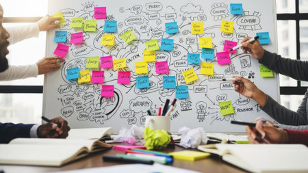 A collaborative group works together, brainstorming ideas on a large whiteboard. Colorful sticky notes cover the surface, connected by lines and notes. The scene features a combination of hands, pens, and notebooks, under bright indoor lighting, suggesting an office environment. Suitable for articles about teamwork and business.