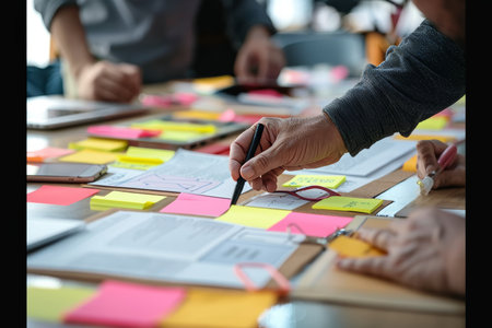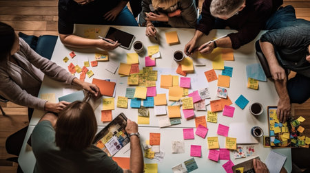 Teamwork in process, people planning with colorful sticky notes on a table, on an indoor background, concept of collaboration. Generative AI