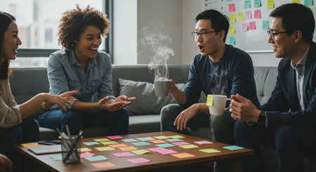 A dynamic office scene capturing a team engaged in a collaborative meeting, utilizing colorful sticky notes for brainstorming and idea generation around a laptop.